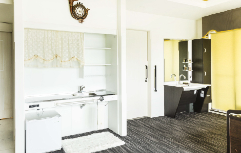 お部屋にはミニキッチン、洗面、トイレ、シャワールーム、クローゼット、デスク、手すりが設備されており、ナースコール等の装置も必要に応じて設置できます。
