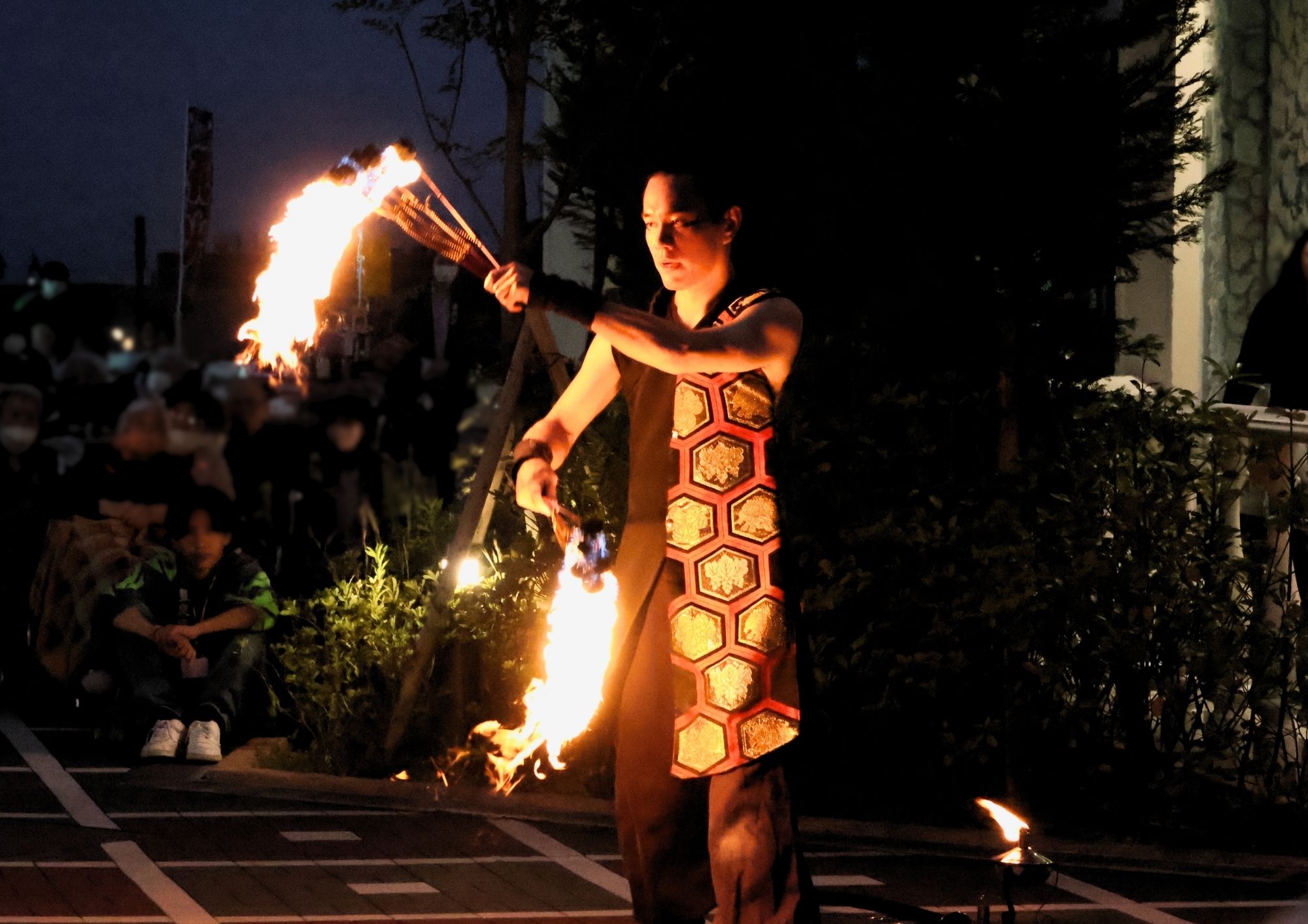 ちょうど辺りも暗くなり始め、夕闇に浮かぶ炎のパフォーマンスはとても幻想的。