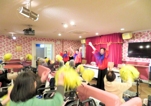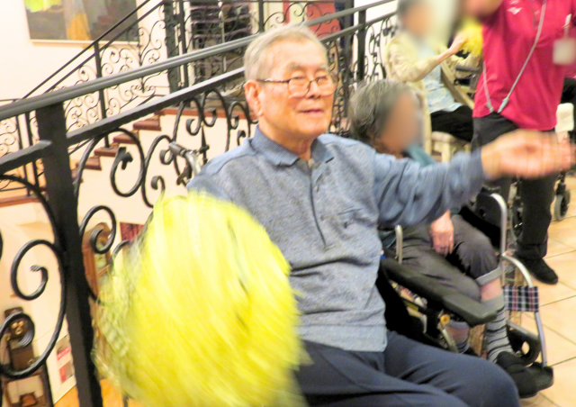 馴染みのある楽曲が流れると、ご入居者の皆様はポンポンを手に取られ、リズムに合わせて自然と手を動かされながら、音楽との一体感を愉しまれているご様子が印象的でした。