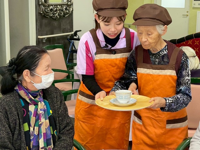また、当日はご入居者の皆様にもお茶とお菓子の提供やオーダー取りをお手伝いいただきました。